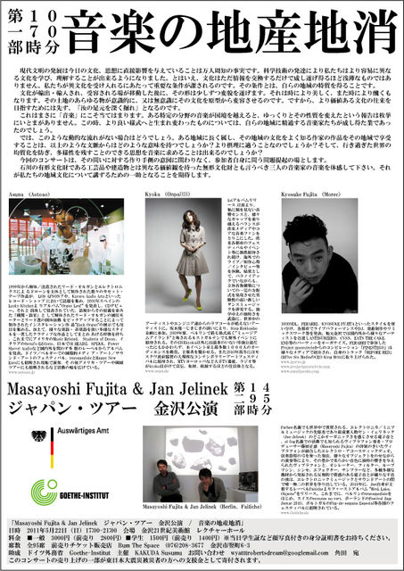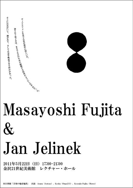 ¡É¥ô¥£¥Ö¥é¥Õ¥©¥ó¤òÁդǤë»Ñ¤¬Ì¸¾õ¤ËÍɤ餤¤À¡£ ¹ß¤êÃí¤°ÅŻҲ»¤Ï¡¢¤Þ¤ë¤ÇÂÀ¸Å¤ÎÀ¸Ì¿¤ÎÌöư¤¹¤ë»èÂΤΤ褦¤Ë¤·¤Ê¤ä¤«¤À¤Ã¤¿¡£ ¤½¤³¤Ë¤ÏÄ»¤¬¤¤¤Æ¡¢¸Ð¤¬¤¢¤ê¡¢¤½¤·¤ÆÃí°Õ¤ò´µ¯¤µ¤»¤ë²¿¤«¤¬¤¢¤Ã¤¿¡£¡É Masayoshi Fujita & Jan Jelinek 2011ǯ5·î22Æü¡ÊÆü¡Ë17:00-21:00 ¶âÂô21À¤µªÈþ½Ñ´Û¡¡¥ì¥¯¥Á¥ã¡¼¡¦¥Û¡¼¥ë ƱÆü³«ºÅ¡Ö²»³Ú¤ÎÃÏ»ºÃÏ¾Ã¡× ½Ð±é¡¡Asuna¡ÊAotoao¡Ë¡¢Kyoka¡ÊOnpa)))))¡Ë¡¢Kyosuke Fujita¡ÊMorec¡Ë Âè°ìÉô £±£·»þ£°£°Ê¬¡¡¡Ö²»³Ú¤ÎÃÏ»ºÃÏ¾Ã¡× ¡¡¸½ÂåʸÌÀ¤ÎȯŸ¤Ïº£Æü¤Îʸ²½¡¢»×ÁÛ¤ËľÀܱƶÁ¤òÍ¿¤¨¤Æ¤¤¤ë¤³¤È¤ÏËü¿Í¼þÃΤλö