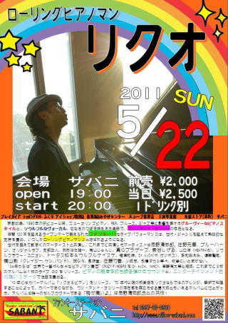 ローリングピアノマン・リクオ ピアノの弾き語りで聴かせます 前売 2000円 当日 2500円 (別途要1ドリンク) 開場 19:00 開演 20:00 数々の有名アーティストとも共演してきたピアノマン ホンモノです必見
