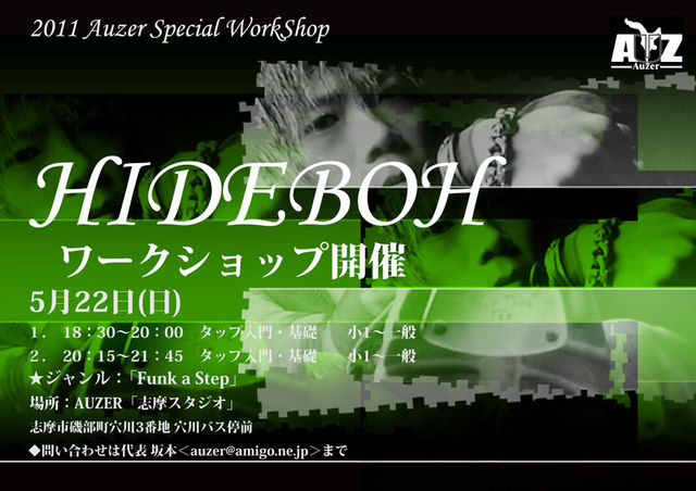 スペシャルワークショップ開催詳細のお知らせです。 あの世界のタップダンサーである「HIDEBOH」が5月22日(日)AUZへタップ指導に来てくれます!!これは凄い!三重県初です!大変、忙しい中スケジュールを調整頂きました。 皆さんお記憶にあると思いますが、北野武監督作品「座頭市」においてTAPシーンの振付け、出演した事により、国内だけでなく海外においても高く評価され、数々の国で実績を残し、HIDEBOH自身のオリジナルスタイル「Funk a Step」を考案し確立しました。 音楽性の高いリズムタップを基調とし、自身の音楽センスを