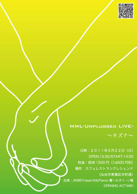 カフェレストランでアンプ無しのアコースティックライブを行います MML -Unplugged Live- 〜キズナ〜 ■日時:2011年5月22日(日) オープン13:30、スタート14:00 ■料金:前売1,500円(ドリンク別) ※高校生以下学生証提示で前売1,000円 ■場所:カフェレストラン クレシェンド 仙台市青葉区木町通1-1-23 永沼ビル1F ■出演:JINBEY・asari・MyPiano・翼・楓 Opening Act MIKI お問い合わせは musicmylife-since2010@mail.goo.ne.jp