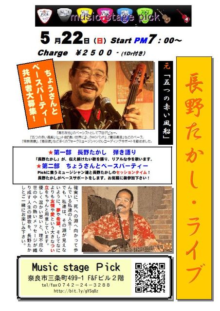 5月22日(日) 「長野たかし・ソロライブ」@奈良「Music stage PickStart」 ■ PM7:00〜 ■Charge \2500‐(1Dr付き) ★第一部 長野たかし 弾き語り ... 「長野たかし」が、伝え続けたい歌を語り、リアルな今を歌います。 ★第二部 ちょうさんとベースパーティー Pickに集うミュージシャン達と長野たかしのセッションタイム! 長野たかしがベースサポートをします。お気軽に御参加下さい! 奈良市三条町499-1 F&Fビル2階 tel/fax0742−24−3288 http://bit.ly/gYSq8z 奈良ではじめてのソロライ