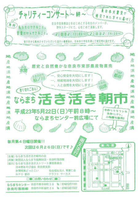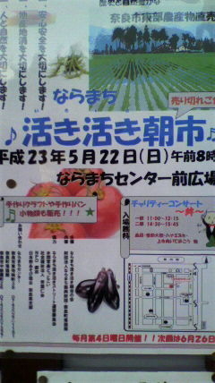 ならまち 活き活き朝市 日時:平成23年5月22日(日) 8:00〜 場所:ならまちセンター前広場 雨天決行 ならまちセンター前広場で朝市が開催されます。 水間・杣ノ川・田原・都祁などの奈良市東部農産物の直売、手作りクラフトや手作りパンなど小物類も販売されます 今回はチャリティーコンサート〜絆〜も同時開催 東日本大震災で被災された方々に届け! 奈良市音楽療法士をはじめとする有志のメンバーが野外ステージにて、心をこめて演奏します。 私たちにできること。音楽だからできること。 入場無料です。