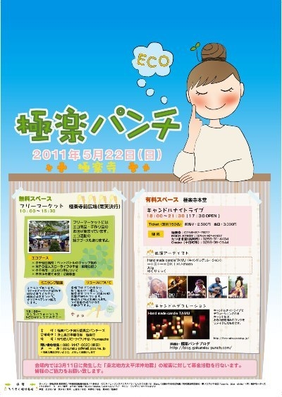 極楽パンチ 2010年5月23日(日) @極楽寺@ ◆無料スペース◆ フリーマーケット 極楽寺前広場(雨天決行) 10:00〜15:30 ◆有料スペース◆極楽寺本堂 キャンドルナイトライブ 18:00〜21:30(17:30 OPEN) ◎出演アーティスト◎ Hand made candle TAiMUhttp://hmactaimu.exblog.jp/(キャンドルデコレーション) 一十三十一×OKI×U-zhaan Ailie ゆっくりっく 前売り:2500円 当 日:3000円 販売 極楽寺:0258−82−7622 ROCKST