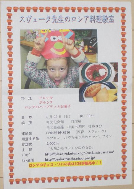 大阪からロシアを広める会と申します。 http://plaza.rakuten.co.jp/osakanirussiawo/ 大阪になりますが、ロシア料理教室を開催します。 メニューはポピュラーなピロシキとボルシチ 関西在住でロシアに興味のある方、よかったら是非参加してみて下さい。