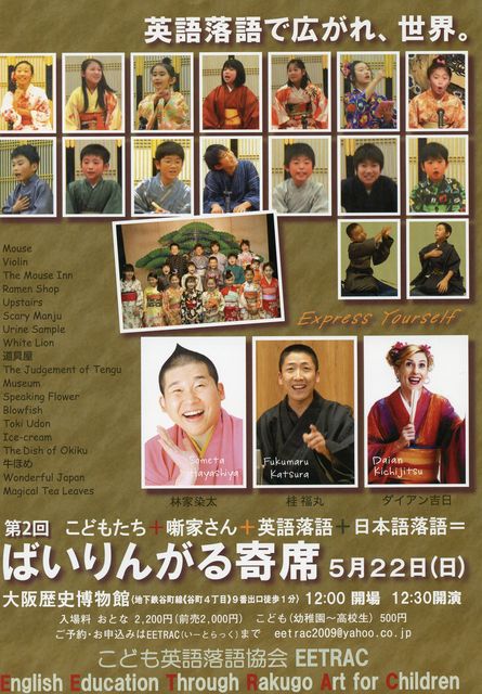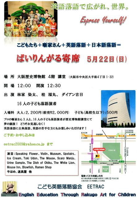 第2回ばいりんがる寄席を行います。 こども演者+噺家さん、英語落語+日本語落語=ばいりんがる寄席 ということで、 こども演者16人 林家染太さん、桂福丸さん、ダイアン吉日さん というプロの噺家さんと同じ舞台で、 競演いたします。 日時:5月22日(日) 12時開場、12時半開演 場所:大阪歴史博物館(地下鉄谷町四丁目 9番出口上がる) 入場料:大人前売り2000円(当日2200円)、こども(高校生以下)500円 今回は大阪歴史博物館という立派な建物の講堂で 行います。 お席も200席以上あります! 是非たくさんの方