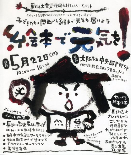 震災復興支援 チャリティーイベント 関西から絵本で元気を届けよう! 5月22日(日) 大阪市立中央図書館 地下鉄西長堀駅 7番出口すぐ http://www.eonet.ne.jp/~mousebbb/hasegawahp/diary.html 長谷川義史、さいとうしのぶ、こしだミカ、近藤薫美子、たかいよしかず、 村上しいこ、市居みか、あおきひろえ、青山友子、山本孝、他? 長谷川義史えほんライブ 10:30〜 絵本作家ミニワークショップ 絵本販売・サイン会 チャリティオークション 義援金募金