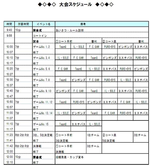 TeamGより大会のご案内です。 昨年も出場いただきましたTeamG A CUPが開催されます。 【2011TeamG A CUP】 日時:2011年5月22日(日)9:30−12:30(拘束時間) 場所:コスパ御殿山内フットサルコート 大阪府枚方市渚内野1-1 http://www.ogsports.co.jp/store/121/ 内容:6チームによる総当り+順位決定戦 費用:6,000円程度/1チーム 以下昨年大会の記録。 http://www.asahi-net.or.jp/~ya9t-kdm/teamg/acup.html