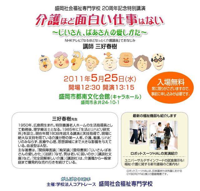 NHKでおなじみ三好春樹先生による講演 「介護ほど面白い仕事はない じいさん、ばあさんの愛しかた」 岩手の復興を支える卒業生の皆さん、お疲れ様です。 みなさんに支えられ、盛社は20周年を迎えました。 そこで、地域貢献する学校として、無料の記念特別講演を行います。 介護の魅力を伝えることで、現場に熱意を、介護を志す人々に希望を持って頂けたらと思います。 あわせて、 オープニングアクトとして71名の在校生による手話うた(3曲) 介護ロボットスーツHALの実演 介護食の展示 介護関連書籍の販売 を行います。