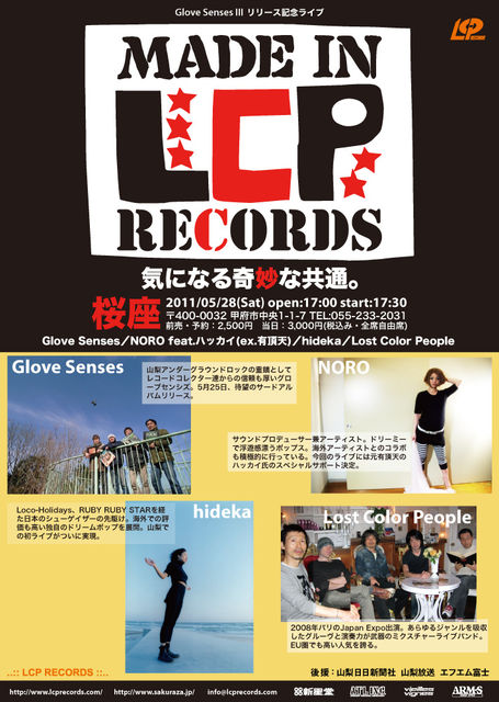 2011/05/28(ÅÚ) Glove Senses III ¥ê¥ê¡¼¥¹µÇ°¥é¥¤¥Ö Made in LCP RECORDS µ¤¤Ë¤Ê¤ë´ñ̯¤Ê¶¦ÄÌ¡£ at ºùºÂ hideka¡¿Glove Senses¡¿NORO feat.¥Ï¥Ã¥«¥¤(ex.Íĺŷ)¡¿Lost Color People¡¿ ¥¤¥Ù¥ó¥È¥Õ¥é¥¤¥ä(PDF 4.38MB) http://www.lcprecords.com/gs3/madein_flier.pdf open:17:00 start:17:30 Á°Ç䡦ͽÌó¡§2,500±ß ÅöÆü¡§3,000±ß ¢¨²Á³Ê¤Ï¤¹¤Ù¤ÆÀǹþ¤ß¡¢Á´Àʼ«Í³ÀʤǤ¹¡£ ¢©400-0032 »³Íü¸©¹ÃÉÜ»ÔÃæ±û1-1-7 TEL:055-233-2031 http://www.sakuraza.jp/ ¤´Í½Ìó¤ÏºùºÂ¡¢¤Þ¤¿¤Ïinfo@lcprecords.com¤Ø