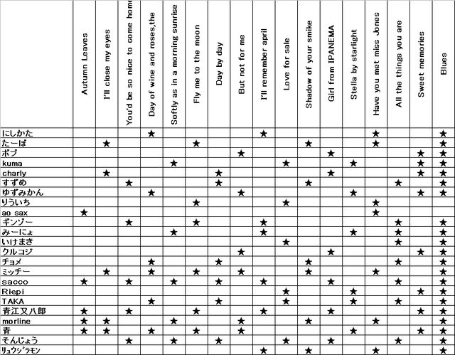 -*-*-*-*-*-*-*-*-*-*-*-*- 【時間割】 09:45 金山駅南口付近に集合 10:00 9Fロビーに集結、集金、あいさつ、小部屋のくじ引き 10:30 小部屋カラオケ1stステージ(60分) 11:30 小部屋カラオケ2ndステージ(60分) 12:30 カラオケ一旦停止、一旦9Fロビーに全員集合 13:00 食事が9Fの小部屋に提供、飲み放題開始(3時間) 14:30 カラオケ再度解禁 18:00 撤収完了 -*-*-*-*-*-*-*-*-*-*-*-*- 【部屋】9F+8Fで計7部屋 (大)ローズ (大)インディゴ (小)アプリコット (小)801 喫煙部屋 (小)80