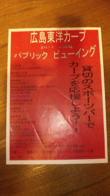 九州・福岡のカープ党のみなさんへ 大イベントのお知らせです☆ 来たる5月29日(日)に博多にて 『カープPV2011 VOL.1@博多』 を開催します!! (※PVとはパブリックビューイングの略称) スポーツバーを貸し切っての 大画面で応援しようという 大規模なイベントです。 ぜひみなさん奮ってご参加下さい!! 【イベント詳細】 ◆タイトル◆ 『カープPV2011 VOL.1@博多』 ◆日時◆ 5月29日(日)13:00試合開始! ◆対戦カード◆ 広島東洋カープ vs北海道日本ハムファイターズ @札幌ドーム