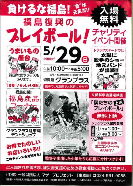 ●開催日: 2011年05月29日(日曜日) ●場 所: 迎賓館グランプラス(福島県郡山市) http://www.granplace.jp/access/index.html 『負けるな福島!"食"は元気だ!! 福島復興のプレイボール!チャリティイベント開催!』 福島県郡山市にて行われるチャリティイベントにて Pinky Pigletsが挿入歌で参加&エキストラ出演した 映画『僕たちのプレイボール』が無料上映されます それに伴い映画公開イベントのために結成された 僕プレSpecial BANDが再集結して 映画上映後にミニライブを行う予定です。 お近くの方は是非お立ち
