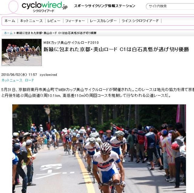 2011 MBKカップ美山サイクルロード 京都府(南丹波市)にてビッグレース『美山サイクルロード』が開催されます。 このレースは美山町の皆さんのご協力の下、広範囲の公道を利用して行われます、数少ない公道レース。 景色も抜群で本来のロードレースの醍醐味が味わえます(^0^)/ ■スタート地点 京都府南丹市美山町島 美山役所前 ■コース 1周10.1kmの周回コース 高低差 110m http://latlonglab.yahoo.co.jp/route/watch?id=e8d2b278c944545018a4f876129dfcca ☆自転車コラム『むぃむぃアタック!』に美山関連の記