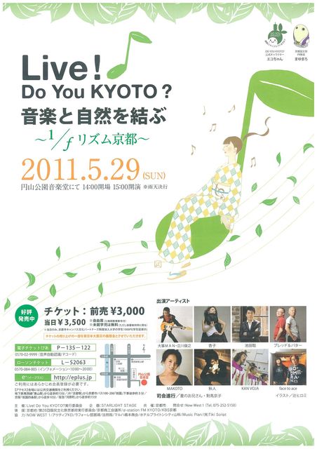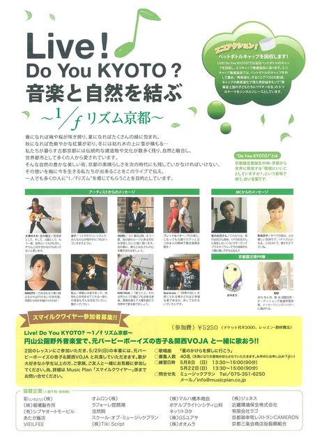 今年も“京都丸山公園野外音楽堂”で開催される 「Live! Do You Kyoto?」に関西VOJAが出演します 今回も素敵なゲストが沢山出演します <出演者> 大事MAN 立川俊之・杏子・池田 聡・ ブレッド&バター・MAKOTO・秋人・ face to face ・KAN VOJA <司会> 星のお兄さん・對島京子 2011.5.29 (sun) 14:00 開場 15:00 開演 チケット/ 前売 3,000 当日 3,500 ********************************************************** スマイルクワイヤー募集のお知らせ 「元・バービーボーイズの杏子 & 関西VOJA と一緒