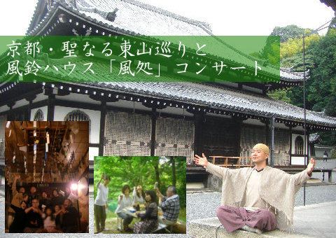 聖なる東山巡りと風処コンサート(バーベキュー付) いにしえから、聖なる東山と呼ばれているエネルギー溢れる数々のお寺、風鈴ハウス「風処」を満喫できる日帰りツアーです。 日常では体験できない空間を風音〜Kazaoto&ユンイが案内します。 日時: 2011年5月29日(日)10時00分〜17時00分 場所: 聖なる東山 定員: 7名(先着順) 料金: 5550円 風音〜Kazaoto&ユンイガイド代、バーベキュー代(ビール1本付き)、風処コンサート代が含まれます。それ以外の支払いは各自負担となります。) 参加者全員に