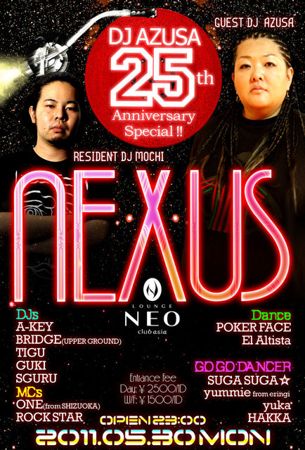 管理人様告知失礼します。 今回Lounge NEOにてDJ AZUSA 25th Annivesaryを開催致します!! 20thは渋谷@HARLEM. 25thは渋谷@Lounge NEOにての開催です!! DJ歴25年を誇るDJ AZUSA!! 都内で活躍中のGUEST DJの方々の先輩DJであり、25年間で培って来た選曲、スキルは、正に本物!! このAnnivesaryを祝福するべく、脇を固めるDJ陣には、渋谷、横浜、そしてDJ AZUSA氏の地元静岡から活躍中のDJ陣が集結!! 当日は、たくさんの方々が祝福に駆け付けるでしょう。 歴史的な一夜は、正にHIPHOPの祭典!!!! 5/30(MON) "NEXUS"@Lounge NEO -DJ AZUSA 25th Ann