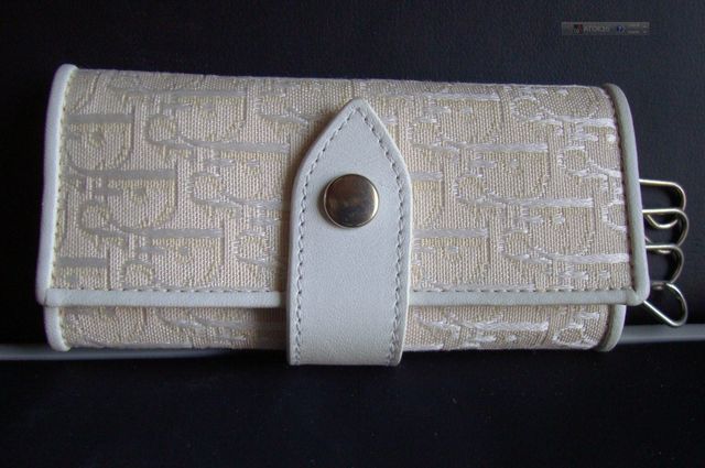 仕事での展示商品の整理をしています。 今度はディオールなんですが、あげる人がいませんのでどなたかお引き取りねがいます。 【商品】  クリスチャンディオール 織り布素材4連キーケース 未使用品 大きさ: W10.5cm×H 5cm 素材:ディオールのロゴを織りこんだ布製  色:淡いピンク 2006年頃に購入店は失念してしまいましたが私が都内の直営店にて (20000円弱程度だったと記憶してます)購入しております。 【難あり部分】 ショーケースの蛍光灯でピンク色が薄くなっております。 バックル側とサイドに展示中に蛍