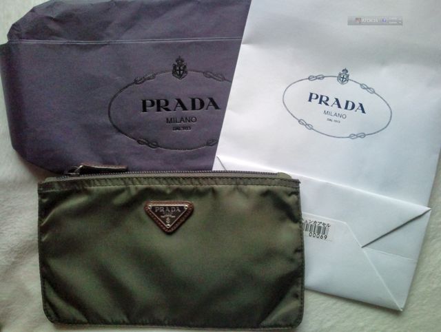 仕事での展示商品の整理をしています。 今度はプラダですがこれも身近であげる人がいませんのでどなたかお引き取りねがいます。 【商品】 PRADA プラダ サテン系布素材ポーチ 未使用品 大きさ: W20cm×H12cm マチがありませんので収納量は少ないですが役に立ちそうです。 素材:PRADAの独特の生地 色:表が焼けて濃グリーン系 裏はチョコレート系の色 画像よりもムラは目立ちません。 伊勢丹新宿店にて私が(15000円程度だったと記憶してます) 購入しておりますので2005年8月5日に購入印のある ギャラン