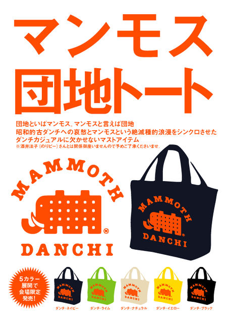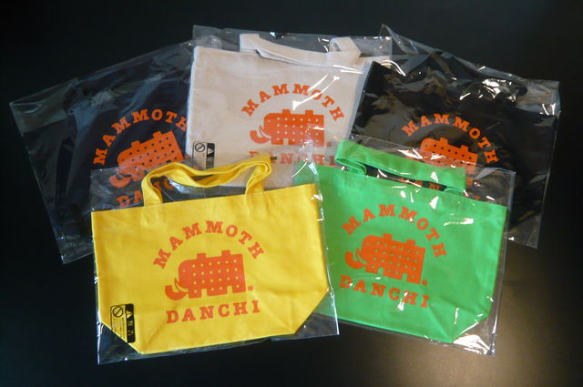 通販受付終了です 2011/05/15の23:59で締め切りでした! たくさんのオファーありがとうございました。 【マンモス団地トート】通販開始 ●完全受注生産/受付開始! 厚手で丈夫なキャンパス素材です 学校、お買い物、犬の散歩などに。 ●素材:12oz キャンパス 綿100% ●サイズ:本体 横30(マチを除く)×縦20×マチ10cm / 持ち手:2.5×29cm内容量:4リットル ●価格は1600円+送料が400円です。 ●ネイビー/ライム/ナチュラル/イエロー/ブラック BAD_ON/ナチュラル/1枚 こんな感じでオファーお待ちしております。