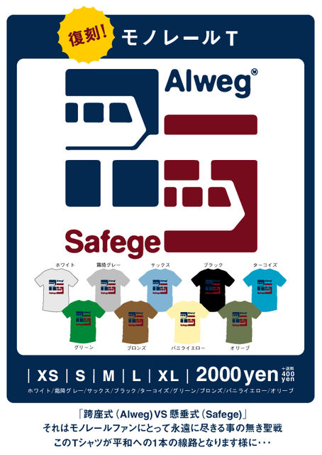 通販受付終了終了です 2011/05/15の23:59で締め切りでした! たくさんのオファーありがとうございました。 --- モノレールのTシャツ。 略して【モノレッT】が リクエストの多かった しっかりアメカジボディで復刻ッス! ご注文いただいた分だけ 完全受注生産させていただきやす。 Color*9 半袖=ホワイト/霜降グレー/サックス/ブラック/ターコイズ/グリーン/ブロンズ/バニライエロー/オリーブ Size*5 XS|身幅43×着丈58 S |身幅47×着丈65 M |身幅50×着丈68 L |身幅53×着丈71 XL|身幅55×着丈74 XXL|身