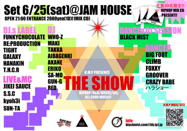 6/25(Sat)@JAM HOUSEにて 一夜限りのBIG EVENT! 好きなジャンルで楽しめる音楽好きは必見! DANCEにLIVEに秋田の各シーンを引っ張る 間違いないジャンルを揃えてお届けします! チケット不要! 急なスケジュール変更があっても大丈夫です★ お早めのご入場はMIX CDが付きますのでお得です! Set 6/25(土) @JAM HOUSE B.M.P PRESENTS... 【THE SHOW】 HIPHOP R&B HOUSE ALL GOOD MUSIC!! ◆OPEN 21:00 ◆ENTRANCE/DRINK 2000yen(1D)(1MIX CD) ◆先着30名限定 HIPHOP R&B MIX