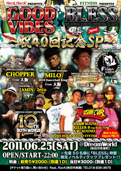 ★6月25日(土)@DREAM WORLD 秋田県。 "GOOD VIBES × BLESS" - 祝40回記念SP - 【SPECIAL GUEST SOUND】 TAKU-ZO SOUND / BOTH WINGS(from東京) / BASS MASTER(from大阪) 【SPECIAL GUEST DANCER】 MILO(from大阪) / CHOPPER(from大阪) 【SOUND】 RUSH HOUR(with Sound System) / 武家屋敷 SOUND / KILLER-B(from BASS TONE) / K4C SOUND 【DANCER】 JAMIN / 2eco OPEN/START-22:00 料金:前売り¥2000-(別途1D)、当日¥3000-(別途1D)。 ※先着50名様に『BLESS』特製、限定ノベルティグッツ、プレゼント!! 場所:D