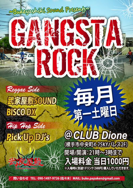 『Gangsta Rock』 vol.7 6/4(土曜日) @CLUB Dione(横手市中央町4-7SKYパレス2F) 開場/開演:21時〜3時まで 当日/\1000 ※入場時に1Drink(\500)購入していただきます 【REGGAE SIDE】 武家屋敷Sound BISCO DX BASS TONE TINNEN 【HIP HOP SIDE】 MOSE MASTER DEF NORI Near Ryou-T.A 【DANCE】 Foxxy [問い合わせ] TEL090-1497-9726 (佐々木) buke.papaken@gmail.com REGGAEとHIPHOPが楽しめる毎月第一土曜日の『Gangsta Rock』 今回も入口に募金箱を設置いたします。