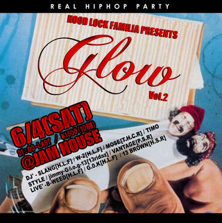 「GLOW」vol.2 @JAM HOUSE 6月4日 PM 21:00〜LAST \1500(1D別) DJ' DJ SLANG[H.L.F] DJ W-2[H.L.F] DJ MOSE[T.H.C.R] DJ TIMO DJ STYLE DJ jimmy-G&o.g-13[13ridaz] DJ VANTAGE[P.S.R] LIVE' B-WEED[H.L.F] G.0.K[H.L.F] 13 BROWN[H.S.R]