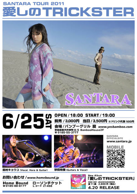 ■Date : 2011/6/25(土) ■Place : 能代市 バンブーグリル窟 秋田県能代市柳町8-5 0185-55-3777 ■Time OPEN : 18:00 START : 19:00 ■ticket Advance : 3000yen Day : 3500yen ※Wituout 1drink ■Reservation ローソンチケット Lコード 21458 メール予約受付アドレス info@santara.jp homeBound 0185-88-8177 hangover_st@livedoor.com ■SANTARA's Info hp SANTARA official Site >http://www.santara.jp/ youtube サンタラ 全国ツアー2011「愛し