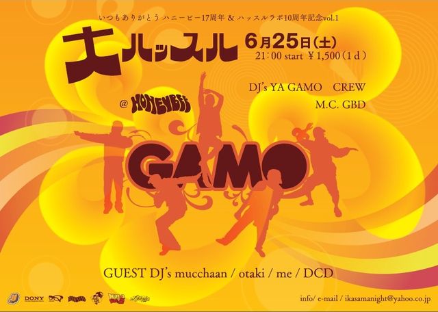 いつもお世話になっております 告知失礼致します 2001年からスタートしました「ハッスルラボ」ですが 今年2011年10周年を迎えることになりました。 今まで御参加頂いたDJの皆様方、遊びにお越し頂いたお客様ありがとうございます。 更に坂本さん いつもどうもありがとう!ハニービー17周年おめでとう! 感謝の気持ちを込めて 素敵なゲストDJの皆様と共に「大ハッスル」VO.1を開催します。 2011年 6月25日(土) @HONEYBEE 「大ハッスル」 START 21:00〜 1,500円(1d) D