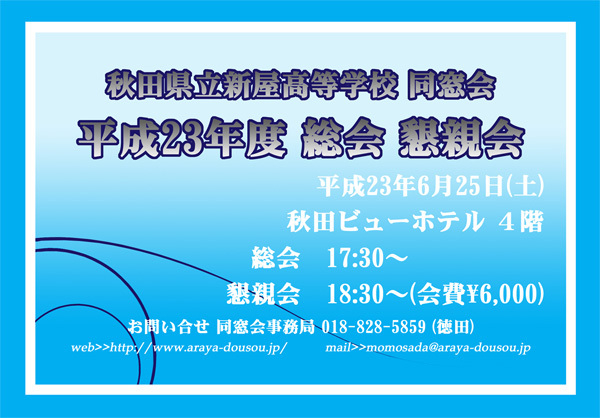 一昨年、昨年に引き続き今年も同窓会の総会と懇親会を開催します。 「総会のみ参加」「懇親会のみ参加」「どちらも参加」など選択可能です。 会費は6,000円。 今年は様々な余興や、食事の形態など考案中です。 昨年の総会で任命された同窓会会長をはじめ 副会長、常任理事、理事が話し合いを重ね、 昨年よりも盛り上げていきたいと張り切っています。 総会は難しそうだけど…という方がいらっしゃいましたら 懇親会だけでも参加してみませんか? もしかしたら懐かしい先生に会えたりするかもしれません。 呼んでほしい先生がいら