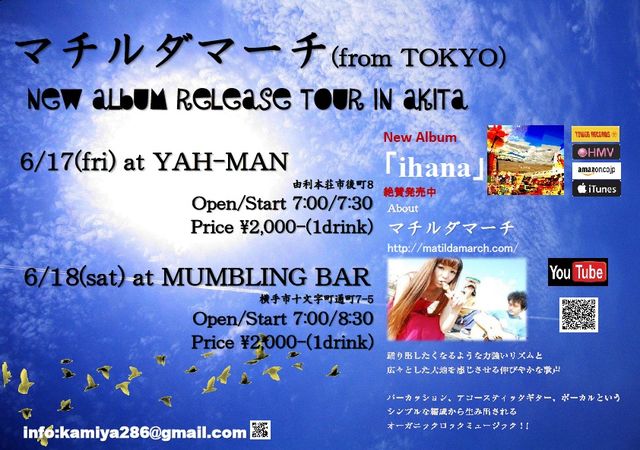 管理人様告知失礼いたします。 【マチルダマーチ(from 東京)】 New Album「ihana」 Release Tour in Akita ◆6/17(fri) at YAH-MAN(秋田県由利本荘市後町8)※詳細地図URL http://yj.pn/ULIq37 Open/Start 7:00/7:30 Price \2,000-(1drink) ◆6/18(sat) at MUMBLING BAR(秋田県横手市十文字町通町7-5)※詳細地図URL http://yj.pn/2Ui4LU Open/Start 7:00/8:30 Price \2,000-(1drink) About マチルダマーチ 踊りだしたくなるような力強いリズムと 広々とした大地を感じさせる伸びやかな歌声 パーカッシ