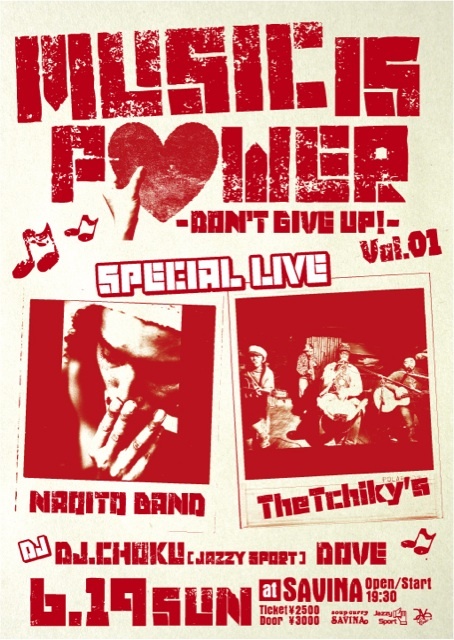 いま、聞きたい いま、聞いてもらいたい いま、感じたい いま、感じてもらいたい そんな音とメッセージを、 いま JazzySport盛岡とスープカレーSavinaと 共に6/19(日)に秋田で響かせます! MUSIC IS POWER vol.01 DON'T GIVE UP! 参加選手 “NAOITO BAND” http://www.myspace.com/naoito http://www.youtube.com/watch?v=k9sjT-4U9FM&feature=player_embedded 東京生まれ純日本人。 19歳で渡米、その後ジャマイカ、ネパール、ブラジル、キューバを旅する生涯旅人。 西アフリカ ガーナのマスタードラマーAj