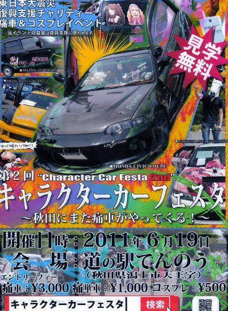 管理人様、貴重なスペースをお借りします。 ーーーーーーーーーーーーーーーーーーーーーーーーーーーーーーーーーーーーーーー イベント名称:第2回 キャラクターカーフェスタ 〜秋田にまた痛車がやってくる!〜 開催日:2011年6月19日 会場:秋田県潟上市 道の駅てんのう(秋田自動車道 昭和男鹿半島ICから降りてまっすぐです。) エントリーフィー 痛車展示 :3000円 痛単車 :1000円(誤りがあったので修正しました) コスプレのみ:500円 見学 :無料 詳細HP http://ww
