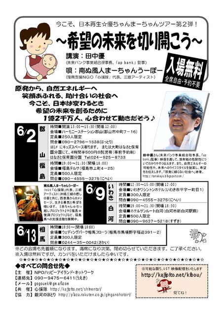 *1名様あたり入場料から500円を東日本大震災の義援金として寄付させて頂きます。また、当日は募金箱も設置しますのでご協力お願いします。