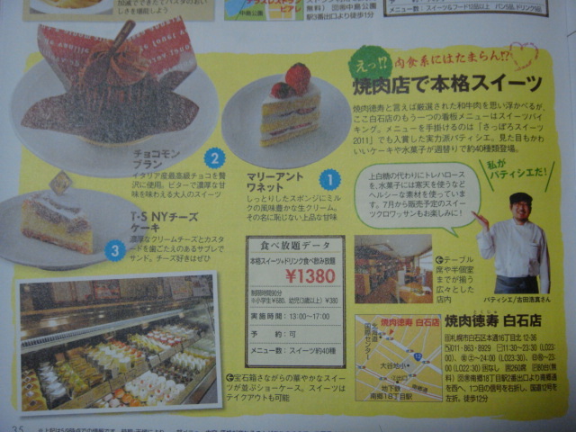 別口オフ・第2弾。 今回は焼肉徳寿で行われてる『スイーツバイキング』です。 注:焼肉店でのバイキング、ですが…焼肉はありませんw (スイーツ&ドリンクのみ) 〜 〜 〜 日時】6月26日(日)PM13:00〜(90分一本勝負) 場所】焼肉徳寿 白石店 札幌市白石区本通16丁目北12-36 ※国道12号線沿い 交)地下鉄東西線・南郷18丁目駅から徒歩12分 料金】 大人:1,380円(スイーツ約40種+ドリンク食べ飲み放題) 子供:小学生 980円、幼児(3歳以上)380円 集合&移動手段】 基本的に現地に12時50