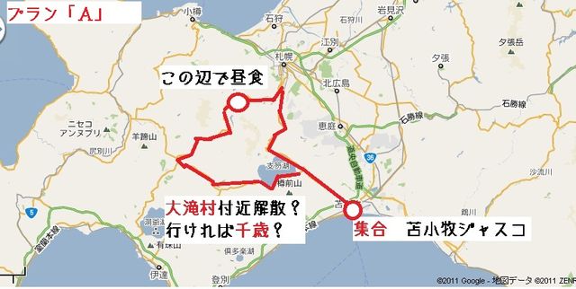 *6月3日更新* ファーストランのリベンジをしようかな!? と、思います(´∀`) 勝手に予定の骨組みだけ立てておきますので 肉付けお願いしますww ○集合〜苫小牧ジャスコ駐車場 ○時間〜9:00 ○コース〜画像参照 支笏湖→札幌手前→中山峠→喜茂別→美笛峠→千歳? コースはこの記載通りで今のところ進めたいと思います! *追加情報 6月2日* 室蘭出発組〜7:20までに海沿いサンクスに集まって、7:30出発します。 他にここに集まる人いれば教えてください(´∀`) サンクス集合メンバー6月