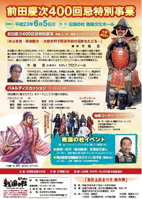 平成23年6月5日(日) 場所:伝国の杜 置賜文化ホールにて 前田慶次400回忌特別事業を行います。 10:00〜11:00 前田慶次400回忌特別講演・・・講師 今福 匡 氏 11:10〜12:40 パネルディスカッション『前田慶次に魅せられて』 パネリスト(予定) 山形県知事・米沢市長・角田信明氏 米澤前田慶次の会 会長 13:30〜 彦根〜米沢『義の継承』支援金引き渡し 14:00〜 角田信明氏写真撮影及びサイン会(予定) 戦国の杜 9:30〜13:30