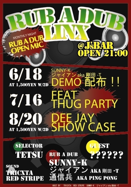 -RUB A DUB LINX vol.2- -毎月第3土曜開催 VOL.1は他県からRUB A DUB参加の為に足を運んでくれた歌い手の方、遊びに来てくれた皆さんありがとうございました! なんと前回GUESTで出演してくれた「DJ GLEAM」がなんとレギュラーに加わりました!皆さんよろしくお願いします。 さぁ勢い止まらずVOL.2のお知らせです! 次は6月18日(土)に開催です! CM完成しました!CHECK! http://www.youtube.com/watch?v=_MNEEJQIbgQ HOST DEEJAY SUNNY-K 音源はこちら http://www.youtube.com/watch?v=Gqm