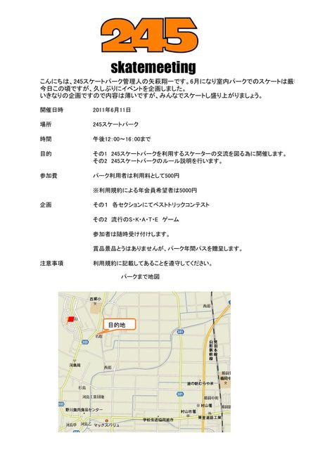 開催日時 2011年6月11日 場所 245スケートパーク 時間 午後12:00〜16:00まで 目的 その1 245スケートパークを利用するスケーターの交流を図る為に開催します。 その2 245スケートパークのルール説明を行います。 参加費 パーク利用者は利用料として500円 企画 ベストトリックコンテスト SKATEゲーム 詳細は、245スケートパーク 矢萩翔一 080-1822-6175 まで