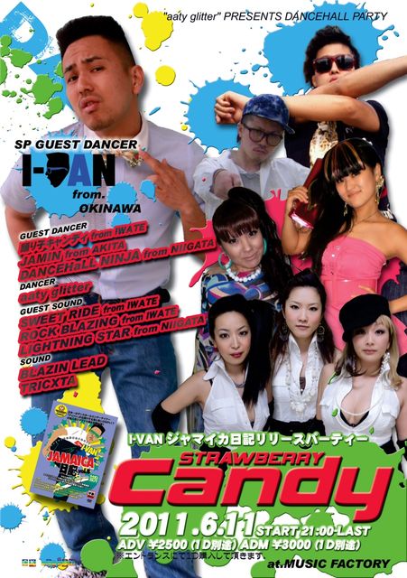 告知失礼します。 酒田では久しぶりのビッグダンスになります!! やっっっばい一夜をお約束します! aatyglitter presents DANCEHALL PARTY 【Strawberry Candy】 〜I-VANジャマイカ日記リリースパーティー〜 2011.6.11(SAT) Open/Start 21:00〜 @Music Factory ADV \2,500 (1D別途) DOOR \3,000 (1D別途) ※エントランスにて1D購入して頂きます。 ●Special Guest Dancer● I-VAN from 沖縄 ●Guest Dancer● 踊り子キャンディー from 岩手 JAMIN from 秋田 DANCEHaLL NINJA from 新潟