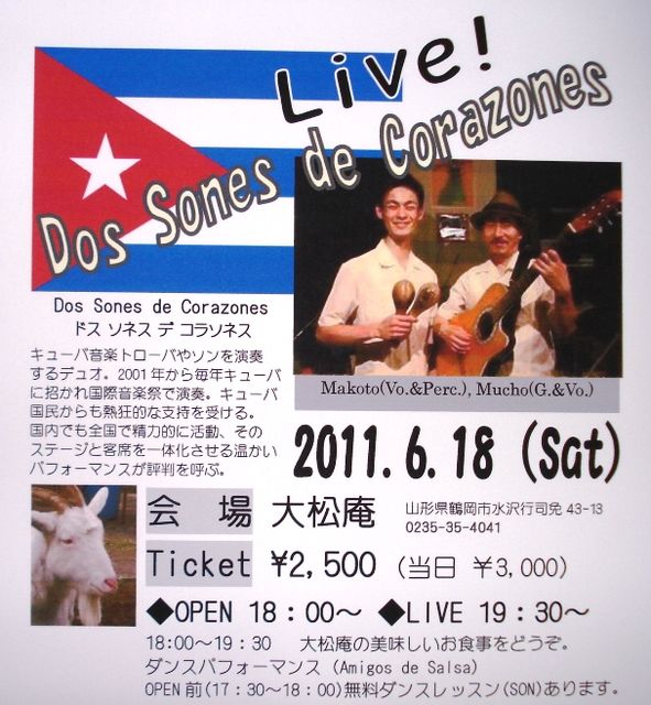 震災後の初イベントです! <Dos Sones de Corazones Live!> あのっドスソネが庄内初ライブです☆ MakotoさんとMuchoさんが奏でる音楽で素敵な夜を過ごしましょう♪ 2011.6.18(土) 会場:大松庵(鶴岡市水沢のお蕎麦屋さん) Ticket:¥2,500(当日¥3,000) ◆OPEN 18:00〜 ◆LIVE 19:30〜 ライブが始まるまで、大松案の美味しいお食事をどうぞ♪ ・ダンスパフォーマンス Amigos de Salsa ・OPEN前(17:30〜18:00)には、初めての方の為に無料ダンスレッスン(SON)