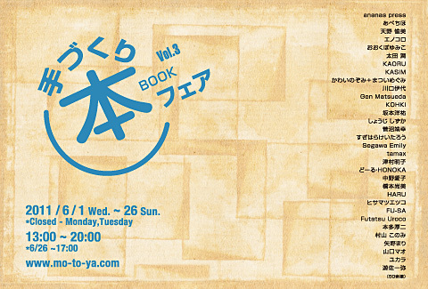2011 / 6 / 1 Wed. ¡Á 26 Sun. ¢¨·îÍË¡¦²ÐÍË ¤ªµÙ¤ß 13:00 - 20:00¡¡¢¨ºÇ½ªÆü¤Ï17»þ¤Þ¤Ç ¥¢¡¼¥Æ¥£¥¹¥È¡¢¥Õ¥©¥È¥°¥é¥Õ¥¡¡¼¡¢¥¤¥é¥¹¥È¥ì¡¼¥¿¡¼¡¢¥Ç¥¶¥¤¥Ê¡¼¡¢¥ß¥å¡¼¥¸¥·¥ã¥ó¡¢·úÃ۲ȡ¢ºî²È¡¢¥·¥ç¥Ã¥×¥ª¡¼¥Ê¡¼¤Ê¤É¤Ê¤ÉÌó30̾¤ÎÊý㤬ºî¤Ã¤¿Ëܤò½¸¤á¤¿¥Ö¥Ã¥¯¥Õ¥§¥¢¤Ç¤¹¡£ ¼«Í³¤ÊȯÁÛ¤ÇÀ©ºî¤µ¤ì¤¿¤Ò¤È¤Ä¤Î¼«¸Êɽ¸½¤ÎÊýË¡¤È¤·¤Æ¤ÎËÜ¡¢¹¥¤¤Ê¤â¤Î¤òõµá¤·¤¿ËܤʤɡĤ¤¤º¤ì¤â¸ÄÀŪ¤ÊËܤФ«¤ê¤Ç¤¹¡£ ¤¢¤Ê¤¿¤Î¤ªµ¤¤ËÆþ¤ê¤Î°ìºý¤ò¸«¤Ä¤±¤Ë¤¤¤é¤·¤Æ²¼¤µ¤¤¡£ MOTOYA Book¡¦Cafe¡¦Gallery ÅìµþÅÔ½Âë¶è½éÂæ2-24-7 http://www.mo-to-ya.com/