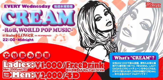 管理人様、告知失礼します。不適切な内容でしたら削除願います。 6月から@六本木flowerにて開催されるNEW PARTY!! 【CREAM】 SOUTH.HIPHOPメインのDJオンリーPARTY♪ Resident DJに“DJ NARI”“DJ SATORU ”そして、PICK UP DJに“DJ Showhey ”さらに東京、八王子、埼玉など各地で活躍するDJを多数迎えフロアをガッツリ盛り上げます!! 女性は1000円飲み放題!! 男性の方も、2000円2ドリンク! さらに、各出演者のディスカウント・ゲストを取得し、ご入場して頂いた方の特典として 女性は1000円飲み放題+Mix CD 男性