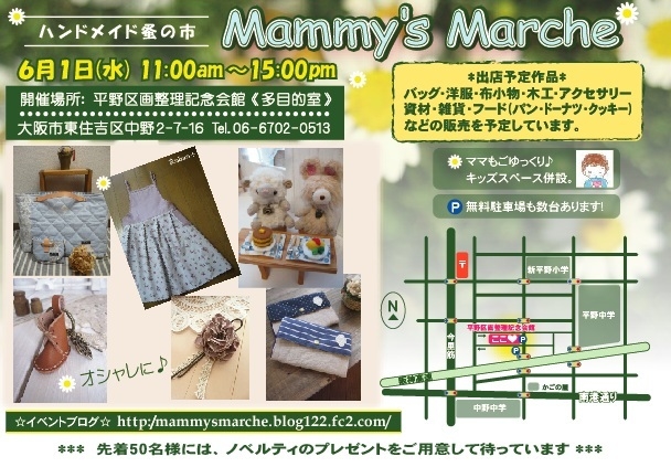6月はイベントが盛りだくさん★ お散歩がてら遊びに来てくださいね♪ さてさて、今回はMammy's Marche のお知らせです。 SB仲間のゆかんちゃん、ゆんゆんちゃん、かりんさん、さくきみでイベント出展致します★ ブース名は「sb*mart」!! キットはもちろん、6インチペーパーの詰め合わせやエンベリなどを、イベント特別価格で出品予定です♪ ぜひ掘り出し物を見つけにきてくださいね。 下記ブログより抜粋 ------------------------------------------------------------ ハンドメイド蚤の市 Mammy's Marche vol.3(マミーズ・