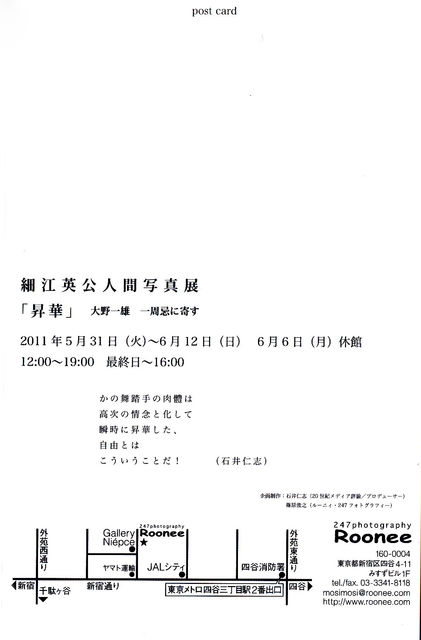 6月1日の大野一雄さんの一周忌を迎えるにあたり、細江さんの心のこもった哀悼の意を展示されることと思います。 ぽれぽれ東中野の追悼 大野一雄 上映会も6月3日まで開かれ、大野一雄さんの世界を今一度思い返してみたいと思います。 写真展会場:Roonee 新宿区四谷4-11 みすずビル1F 会期:2011年5月31日〜6月12日 6月6日休館 12:00〜19:00 最終日〜16:00