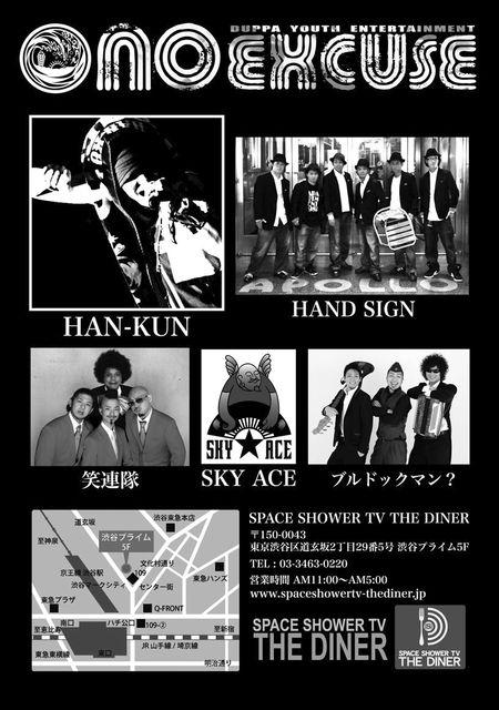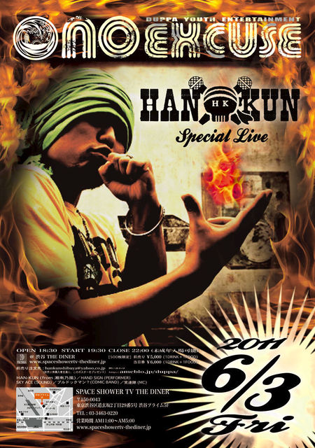 管理人様告知失礼いたします [NO EXCUSE]が次に届ける HAN-KUN SPECIAL LIVE 2011.6月3日 (金) OPEN 18:30 START 19:30 CLOSE 22:00 (未成年入場可能) @THE DINER in 渋谷(日本最大級のMUSICレストラン) 東京都渋谷区道玄坂2-29-5渋谷プライム5F (http://www.spaceshowertv-thediner.jp) <出演者> HAN-KUN fr. 湘南乃風 ブルドックマン? (COMIC BAND) HAND SIGN (PERFORMER) SKY ACE (SOUND) 笑連隊 (MC) メール予約、当日券 ¥6.000(1drink、1food、下記のB2[515×728]mmポスター) *前売り券の発売は終了しました。