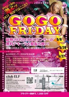 管理人様、書き込み失礼致します。 6/3金曜日! 渋谷ELFにて開催のGO GO FRIDAY 1周年で爆発的な盛り上がりを見せた渋谷ELFにて、 盛り上がりNo.1のGO GO FRIDAY 20名近くのGO GOダンサーがフロアをヒートアップします 女性主体のイベントなので 初心者の人も1人で来た方もバッチリ楽しんで頂ける アットホームなイベントです メインフロアでは、 LADY GAGA,NE-YO,RIHANNA,USHER,PITBULL などの大ヒット曲満載 都内各地で活躍するDJ陣がGROOVYな選曲で盛り上げます また、