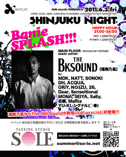 渋谷axxcisが新宿にも進出いたしました! 歌舞伎町 ※新宿axxcis※ グランドオープンパーティー にて、800名のお客様にご来場頂きました・ ご来場になったお客様、 関係者の方これからも末長くよろしくお願いします(^^) 2011/ 6/3(金) 豪華キャストにて開催! SP GUESTとして、、 な、なんと!湘南乃風より ■The BK Sound(湘南乃風) ※ゲストでの入場方法 ゲスト希望の方はメールください(^ー^)ノ マイミクして頂けると 嬉しいです(>_<) ★★★★★★★★★★★ Club新宿axxcisエントランスにてゲストで【DJ U-MIYAZAWA】