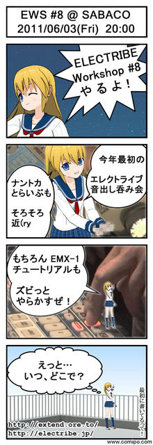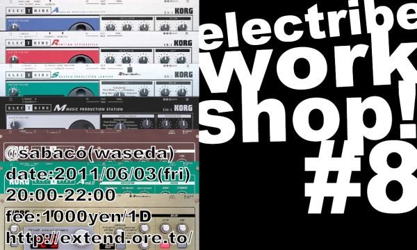■再開です! 3月11日に行えなかった第8回が、6月3日開催となりました! ■ELECTRIBE Workshop #8 date : 2011/06/03(fri) 20:00〜22:00 fee : 1000yen/1D ※バー営業時間内に行います。 ※バー営業は19:00〜24:00です。先に入ってお酒を飲んで待っていると幸せです。 ※内容によって、時間が前後する可能性があります。 ■音楽喫茶 茶箱@早稲田 http://sabaco.jp/ ■お知らせ KORGエレクトライブシリーズを主題とした機材交流(呑み)会。 前回に引き続きEMX-1のチュートリアルがあります。 興味あるけど触ったことない、持ってるけ